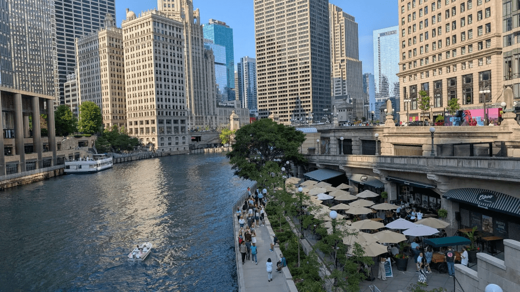 Stroll the lively Chicago Riverwalk, home to outdoor cafes, wineries, and shops. The riverwalk comes alive when it is filled with walkers and diners particularly in Summer.